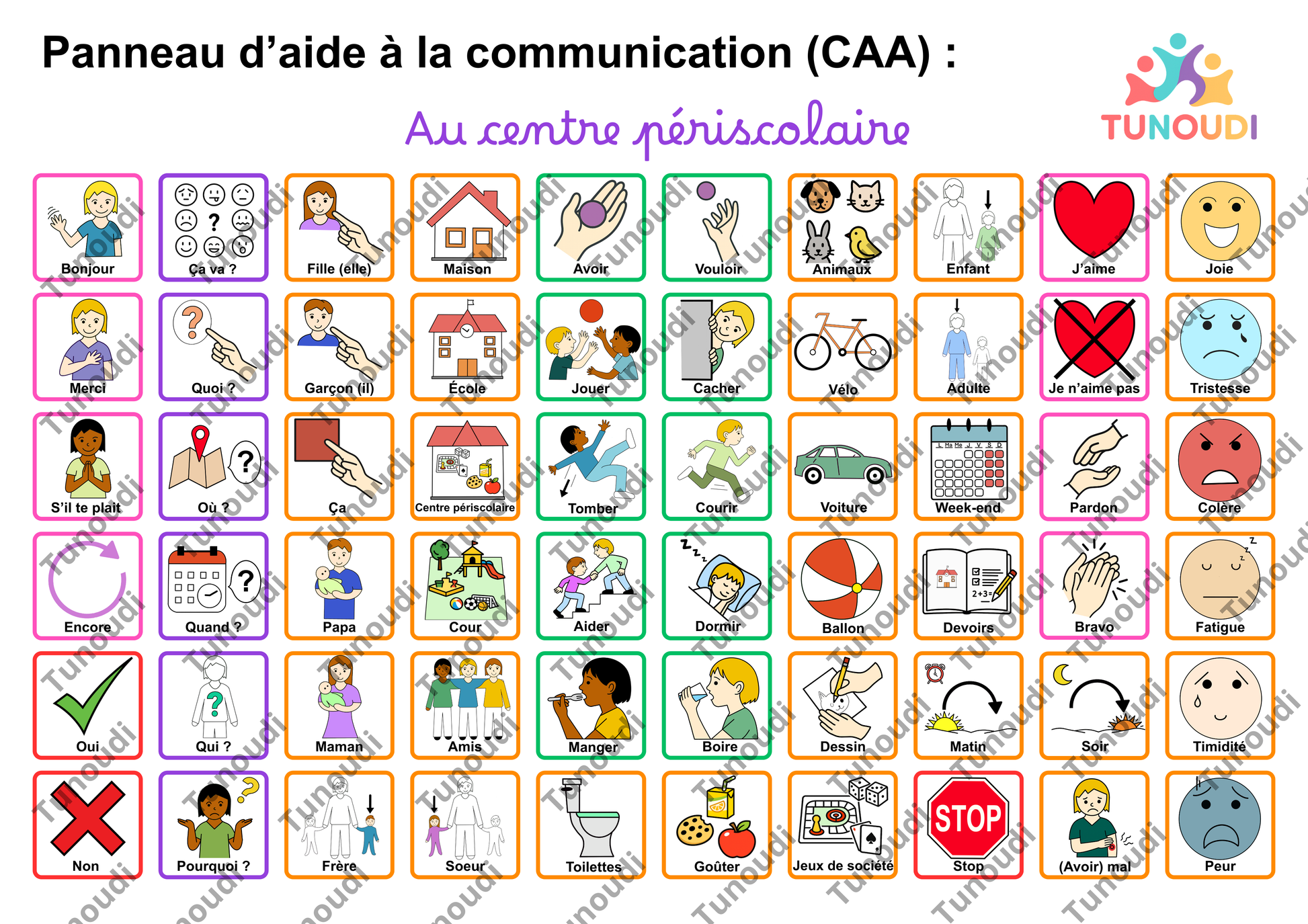 Ce panneau de communication est conçu pour faciliter les échanges dans les espaces périscolaires. Grâce à 60 pictogrammes simplifiés, chacun dispose d’un support visuel pour exprimer ses besoins, ses envies, ses émotions ou participer aux activités du quotidien.